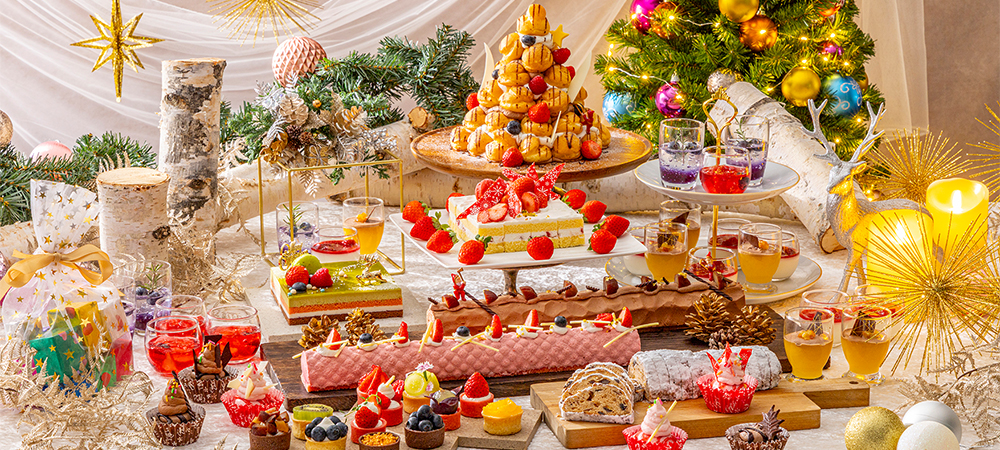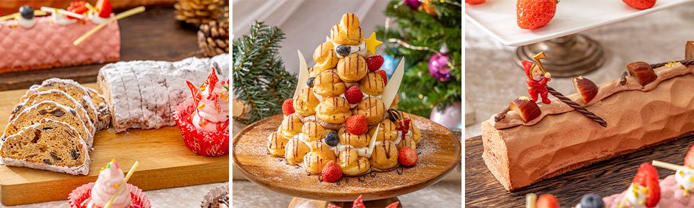 デザートエリアには、フランスの伝統的なクリスマスデザート「ブッシュドノエル」やドイツのクリスマス菓子「シュトーレン」、クリスマスツリーのようなデコレーションが豪華な「プロフィットロール(ディナーのみ)」など、見た目にも楽しいホテルメイドのスイーツも豊富にご用意いたします。
