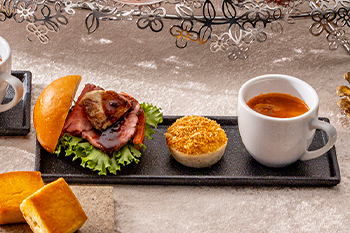 ローストビーフとフォアグラのミニバーガーやミネストローネなどのセイボリーとともに、