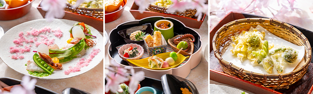 可愛らしい桜のお重を開けるとそこには、桜海老や筍、三食団子など、五感で「春」を感じていただけるような、華やかなお料理の数々。美しい桜の花びらが舞い、まるでお花見をしているよう。