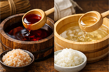 長期熟成による深い旨みとまろやかなコクを湛えた「赤酢」。 米のやさしい甘みと、キレのある酸味が際立つ「白酢」。
