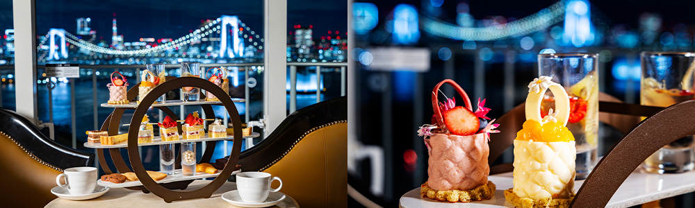 アフタヌーンティー仕立ての華やかなスイーツをお届け。窓際のソファで夜景を背景に、フォトジェニックなひとときを。↓