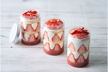 8粒のストロベリーとあっさりとした生クリーム、しっとりとしたスポンジにカスタードクリームを、カップの中にギュッと詰めた、見た目にも可愛らしいショートケーキ。