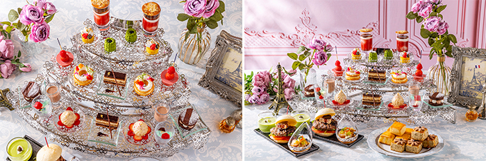 カカオ分が35%以上のクーベルチュールを使用した濃厚な「ガトーショコラ」やアーモンドパウダーを使用した生地とコーヒー風味のバタークリームが層になったフランス・パリのオペラ座を模したといわれる「オペラ」をはじめ、フランス・ボルドーの女子修道院が発祥とされ、香ばしくカリっとした食感とバニラ、抹茶の香りがアクセントとなる「カヌレ」、フランスの自転車レースに由来し、その都市の名を冠した「パリ・ブレスト」など、見るだけでも楽しいスイーツがエレガントなアフタヌーンティースタンドに並びます。