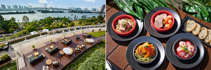 煌めく東京の街並みやレインボーブリッジ、東京タワー®などのパノラマビューを、移りゆく時間帯とともにお楽しみいただける「テラスラウンジ」