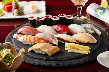 寿司「さくら」の寿司職人が丹精に手を加えた鮪や寒鰤、河豚鍋などお祝いに合わせた豪華食材をご堪能いただけます。