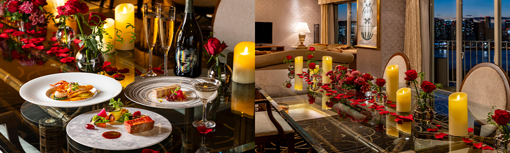優雅な滞在は一般客室から始まり、夕刻にはサプライズで広々としたスイートルームへ。お部屋でプライベートディナーと煌めく夜景、薔薇に彩られたベッドルーム、さりげなく指輪をモチーフとした特別なデザート。